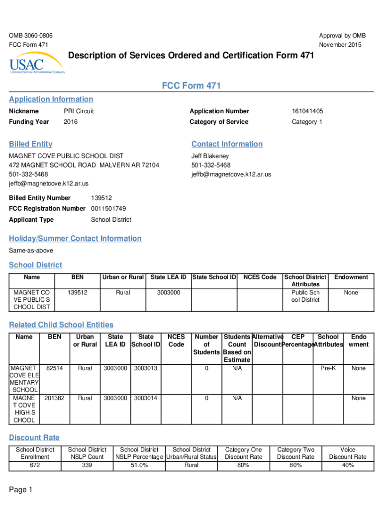 OMB 30600806 FCC Form 471Approval by OMB November 2015Description of Services Ordered and Certification Form 471 FCC Form 471 Application Information NicknamePRI CircuitApplication Number161041405Funding