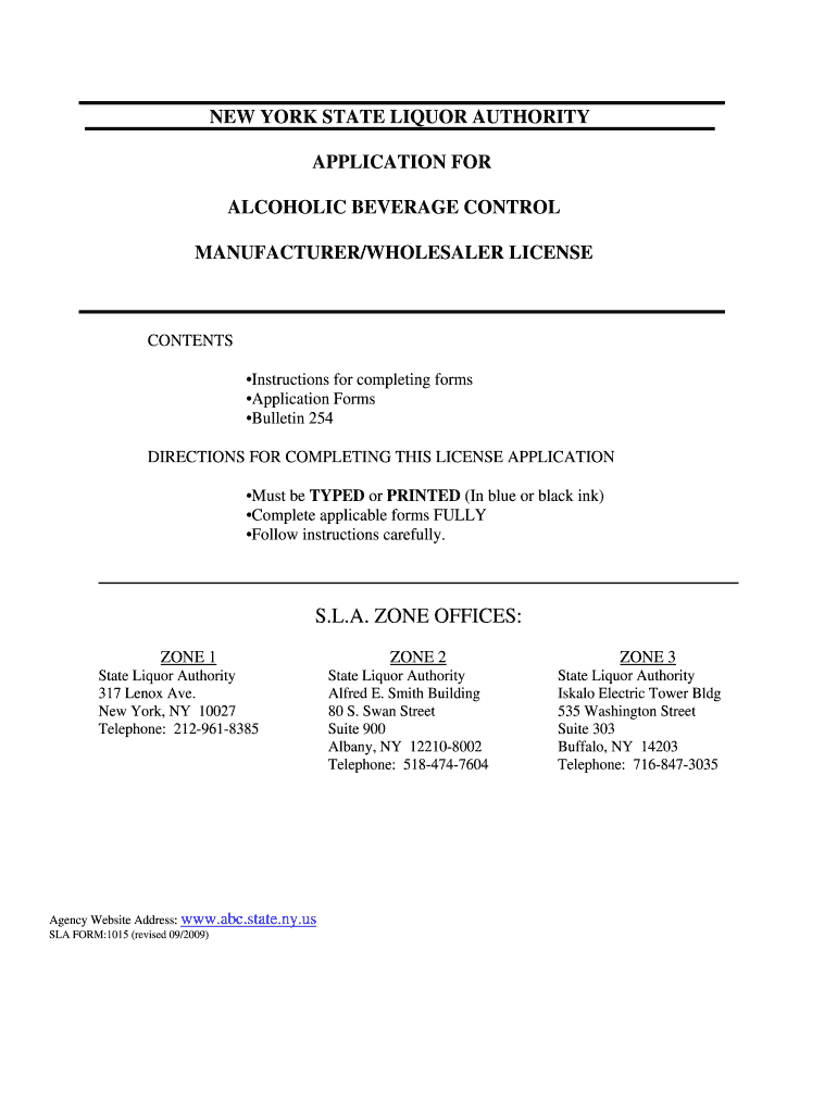 NEW YORK STATE LIQUOR AUTHORITY APPLICATION FOR ALCOHOLIC BEVERAGE CONTROL MANUFACTURER/WHOLESALER LICENSE CONTENTS Instructions for completing forms Application Forms Bulletin 254 DIRECTIONS FOR