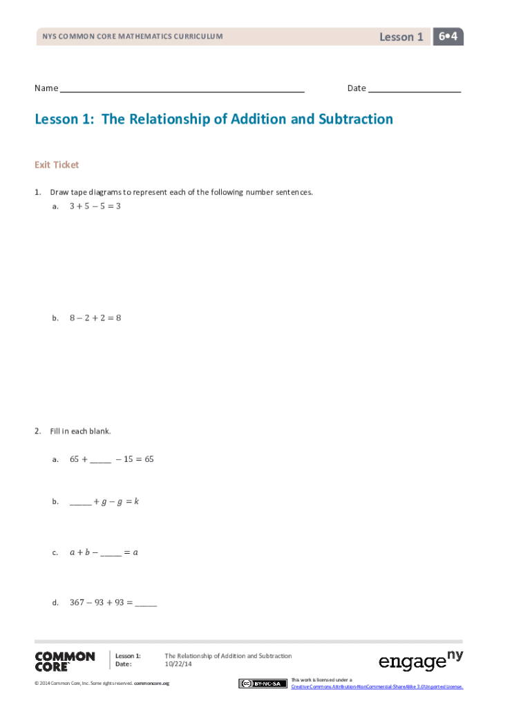 Lesson 1NYS COMMON CORE MATHEMATICS CURRICULUMName64DateLesson 1: The Relationship of Addition and Subtraction Exit Ticket 1.2. Draw tape diagrams to represent each of the following number sentences.