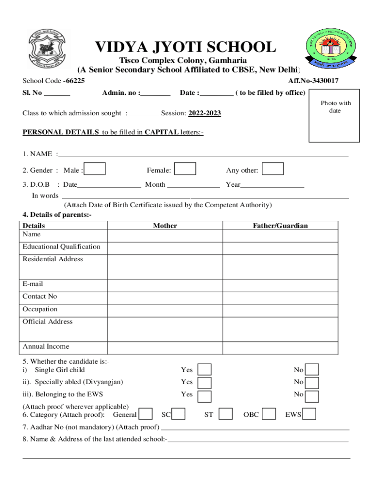 Step 1: Obtain the application form from Vidya Jyoti School TISCO.