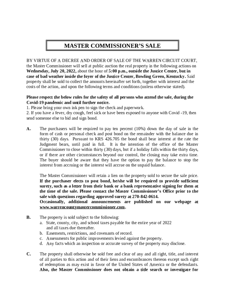 - Look for the BY VIRTUE OF A DECREE AND ORDER OF SALE OF THE WARREN CIRCUIT COURT, the Master Commissioner will sell at public auction the real property in the following actions on Wednesday, July 20, 2022, about the hour of 5:00 p form in PDFfiller’s library.