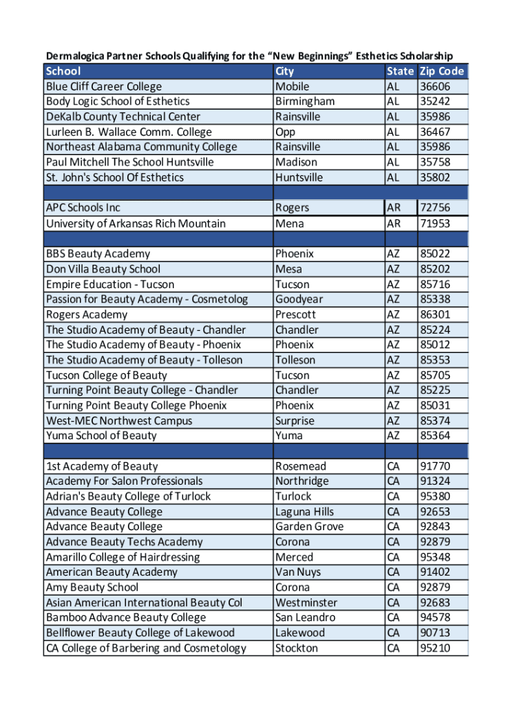 Dermatological Partner Schools Qualifying for the New Beginnings Aesthetics ScholarshipSchool