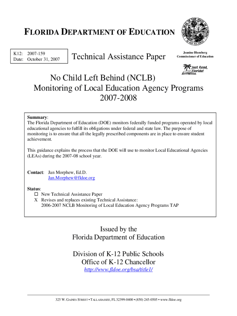 FLORIDA DEPARTMENT OF EDUCATION K12: 2007159 Date: October 31, 2007Technical Assistance Paper Jeanine Bloomberg Commissioner of Education No Child Left Behind (CLB) Monitoring of Local Education Agency