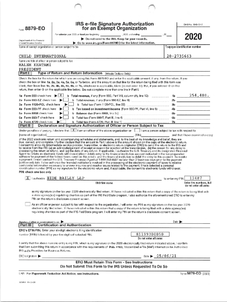 IRS file Signature Authorization, ., ggTgEoOMB No. 15450047for an Exempt Organization calendar year 2020, or fiscal year beginning)Department of tho Treasury