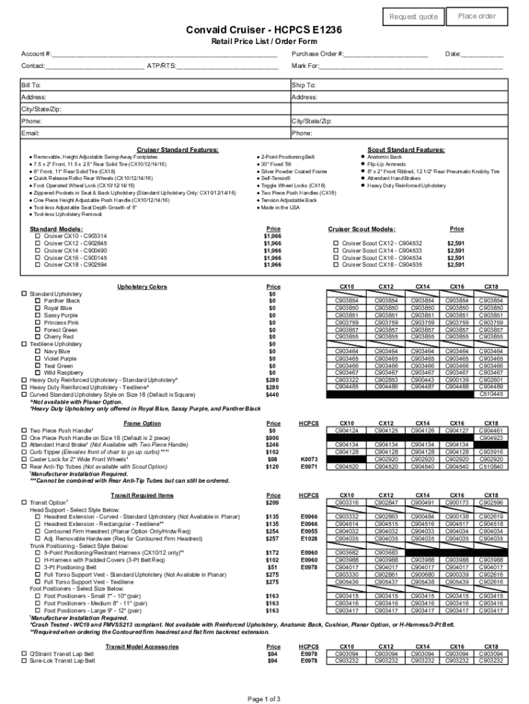 Request quotePlace orderConvaid Cruiser HCPCS E1236 Retail Price List / Order Form Account #:___Purchase Order #:___Date:___Contact:___ ATP/RTS:___Mark For:___Bill To:Ship To:Address:Address:City/State/Zip: