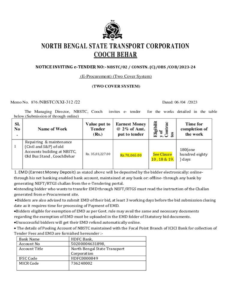 Get the free NOTICE INVITING e-TENDER NO:- NBSTC/02 / CONSTN