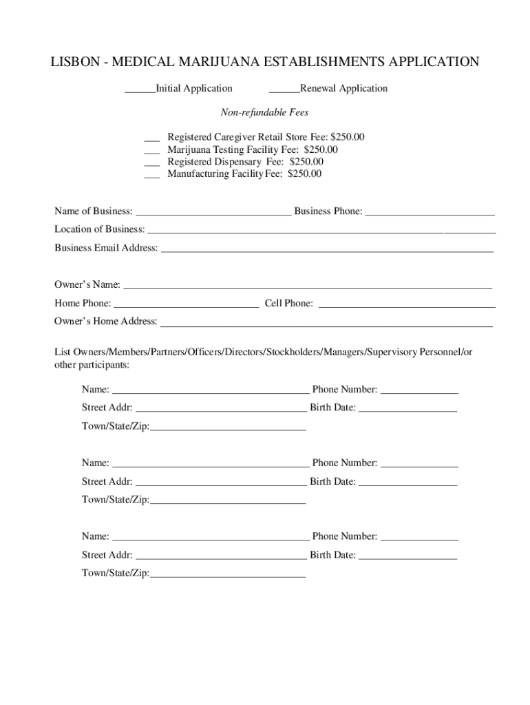 LISBON MEDICAL MARIJUANA ESTABLISHMENTS APPLICATION ___Initial Application___Renewal Application Nonrefundable Fees ___ ___ ___ ___Registered Caregiver Retail Store Fee: $250.00 Marijuana Testing