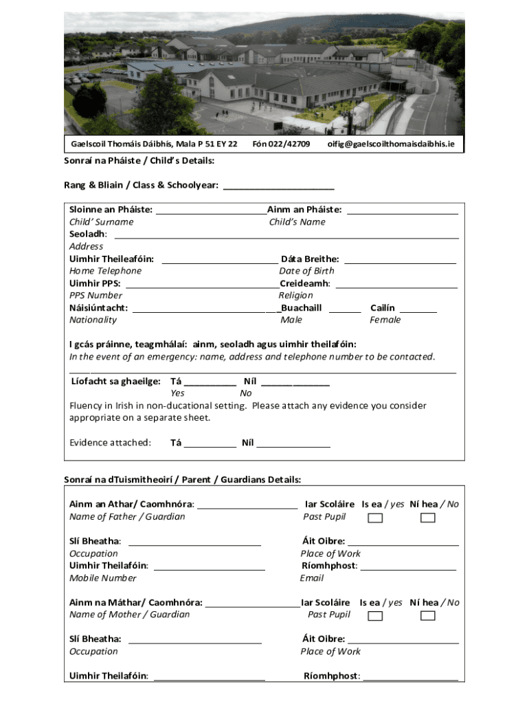 Gaels coil Thomas Dibs, Male P 51 EY 22Fn 022/42709oifig@gaelscoilthomaisdaibhis.ieSonra Na Piste / Child's Details: