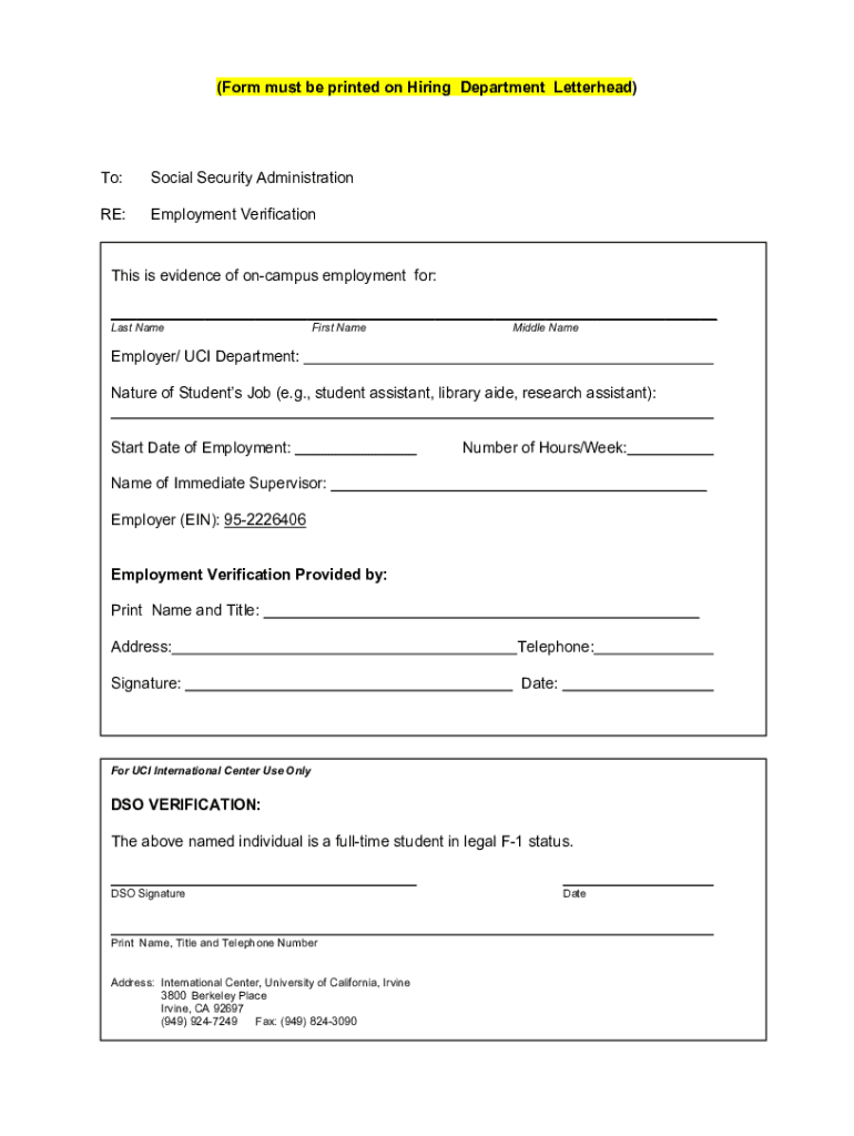(Form must be printed on Hiring Department Letterhead)To:Social Security Administration RE:Employment Verifications is evidence of on campus employment for: ___ Last NameFirst NameMiddle NameEmployer/