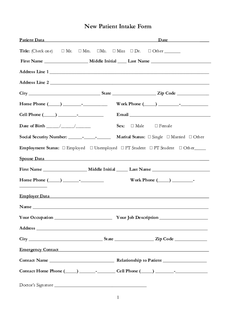 New Patient Intake Form Patient Data Title: (Check one)Date Mr. Mrs.Ms. Miss Dr.___ Other ___First Name ___ Middle Initial ___ Last Name ___ Address Line 1 ___ Address Line 2 ___ City ___ State ___