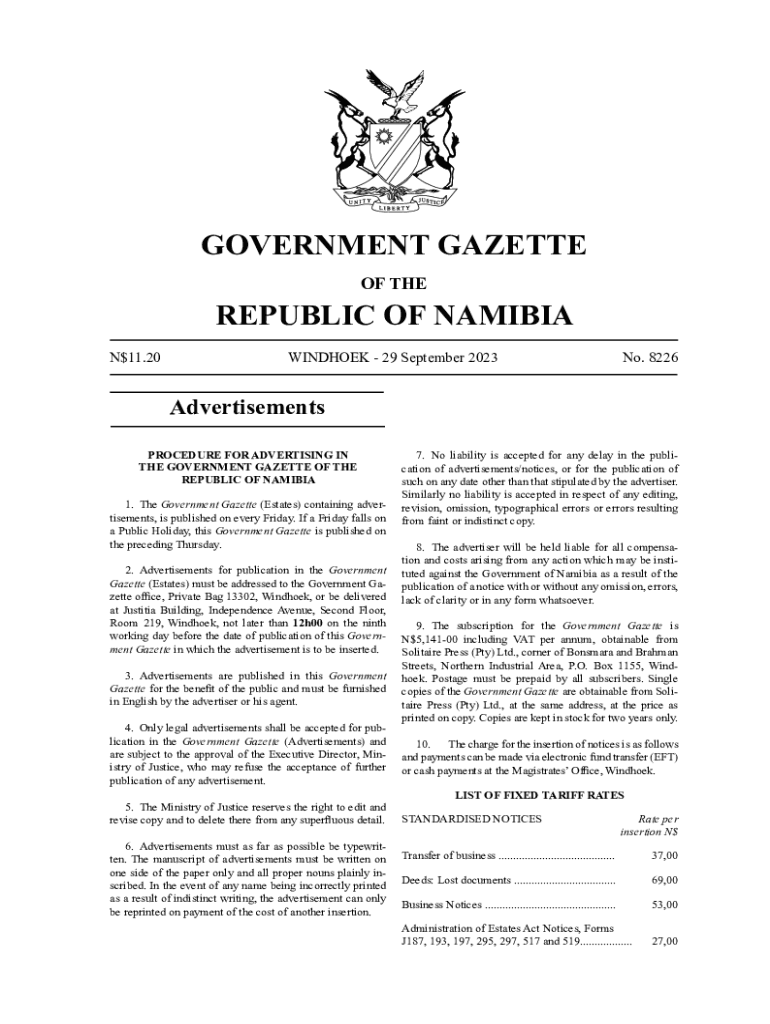 GOVERNMENT GAZETTE OF THEREPUBLIC OF NAMIBIA N$11.20WINDHOEK 29 September 2023 No. 8226Advertisements PROCEDURE FOR ADVERTISING IN THE GOVERNMENT GAZETTE OF THE REPUBLIC OF NAMIBIA1. The Government