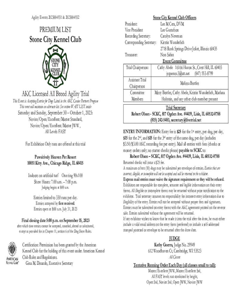 Agility Events 2023004931 & 2023004932PREMIUM LIST Stone City Kennel Club AKC Licensed All Breed Agility Trial This Event is Accepting Entries for Dogs Listed in the AKC Canine Partners Program This