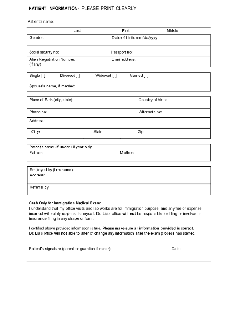 PATIENT INFORMATION PLEASE PRINT CLEARLY Patient\'s name: LastFirstMiddleGender:Date of birth: mm/dd/yyyySocial security no:Passport no:Alien Registration Number: (if any)Email address:Single [ ]Divorced[