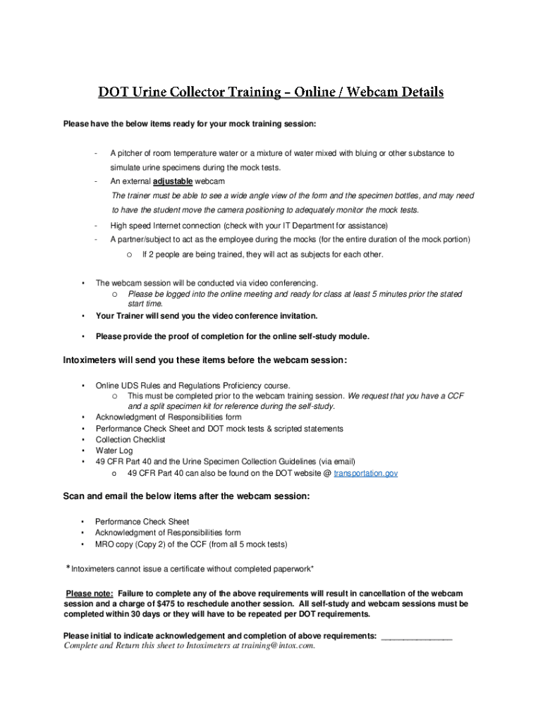 Please have the below items ready for your mock training session:A pitcher of room temperature water or a mixture of water mixed with bluing or other substance to simulate urine specimens during the