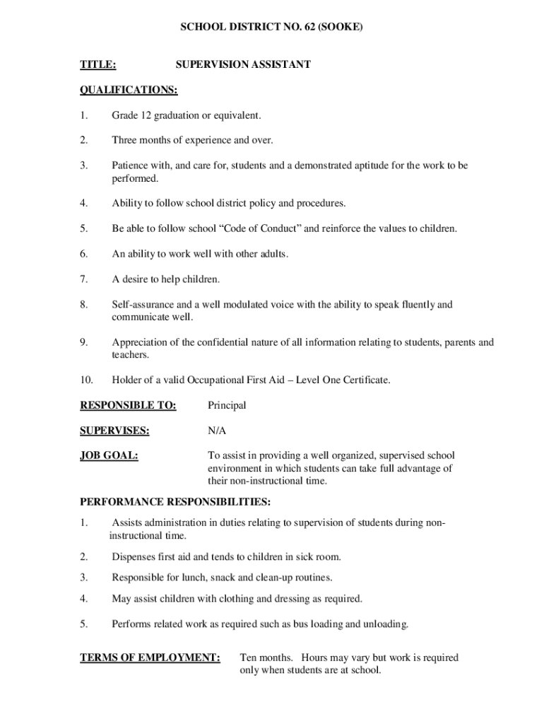 SCHOOL DISTRICT NO. 62 (SPOKE)TITLE:SUPERVISION ASSISTANTQUALIFICATIONS: 1. Grade 12 graduation or equivalent.2. Three months of experience and over.3. Patience with, and care for, students and a