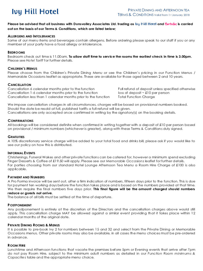 PRIVATE DINING AND AFTERNOON TEA TERMS & CONDITIONS Valid from 1st January 2018 Please be advised that all business with Dunsvalley Associates Ltd. trading asand Bartellas is carriedout on the basis