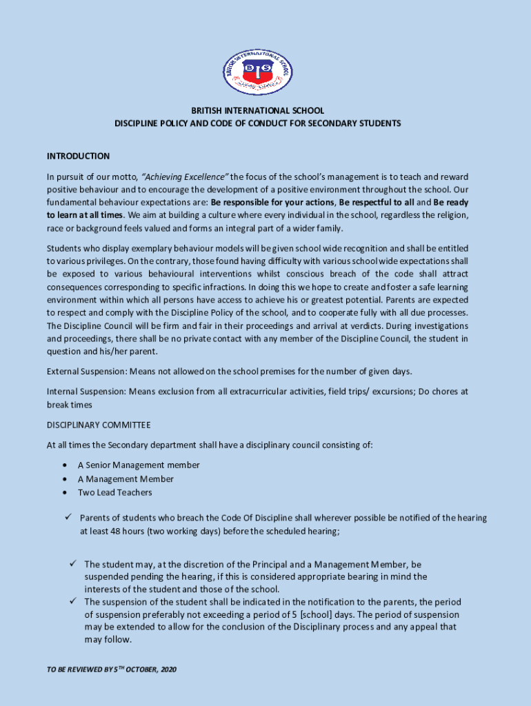 BRITISH INTERNATIONAL SCHOOL DISCIPLINE POLICY AND CODE OF CONDUCT FOR SECONDARY STUDENTS INTRODUCTION In pursuit of our motto, Achieving Excellence the focus of the schools' management is to teach