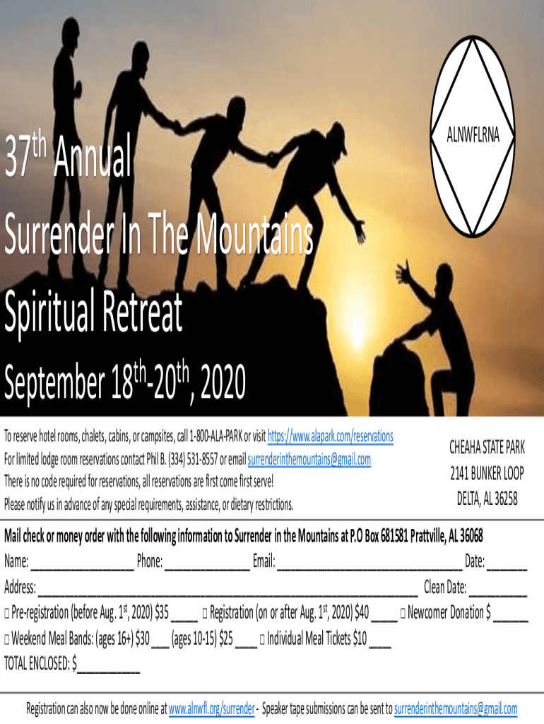 37thAnnual Surrender In The Mountains Spiritual RetreatALNWFLRNASeptember 18th20th, 2020 To reserve hotel rooms, chalets, cabins, or campsites, call 1800ALAPARK or visit https://www.alapark.com/reservations