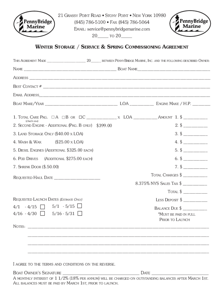 21 GRASSY POINT ROAD STONY POINT NEW YORK 10980 (845) 7865100 FAX (845) 7865064 EMAIL: service@pennybridgemarine.com 20___ TO 20___WINTER STORAGE / SERVICE & SPRING COMMISSIONING AGREEMENT THIS AGREEMENT