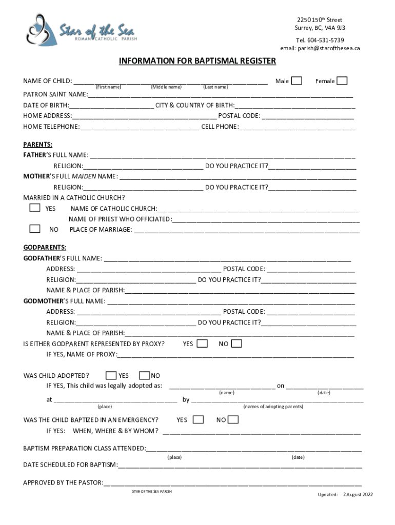 2250 150th Street Surrey, BC, V4A 9J3 Tel. 6045315739 email: parish@starofthesea.caINFORMATION FOR BAPTISMAL REGISTER NAME OF CHILD: ___ (First name)(Middle name)(Last name)MaleFemalePATRON SAINT
