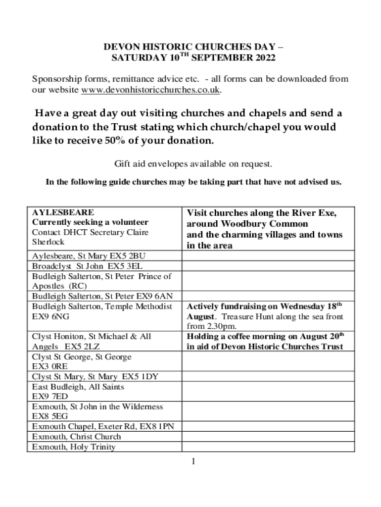 DEVON HISTORIC CHURCHES DAY SATURDAY 10TH SEPTEMBER 2022 Sponsorship forms, remittance advice etc. all forms can be downloaded from our website www.devonhistoricchurches.co.uk.Have a great day out