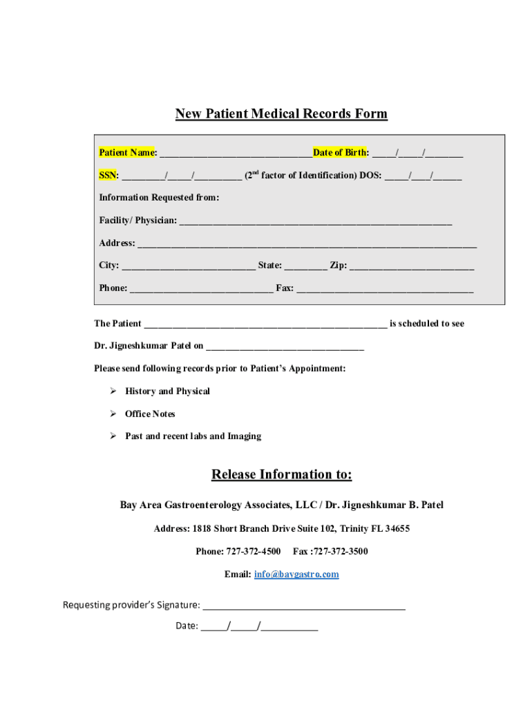 New Patient Medical Records Form Patient Name: ___Date of Birth: ___/___/___ SSN: ___/___/___ (2nd factor of Identification) DOS: ___/___/___ Information Requested from: Facility/ Physician: ___ Address: