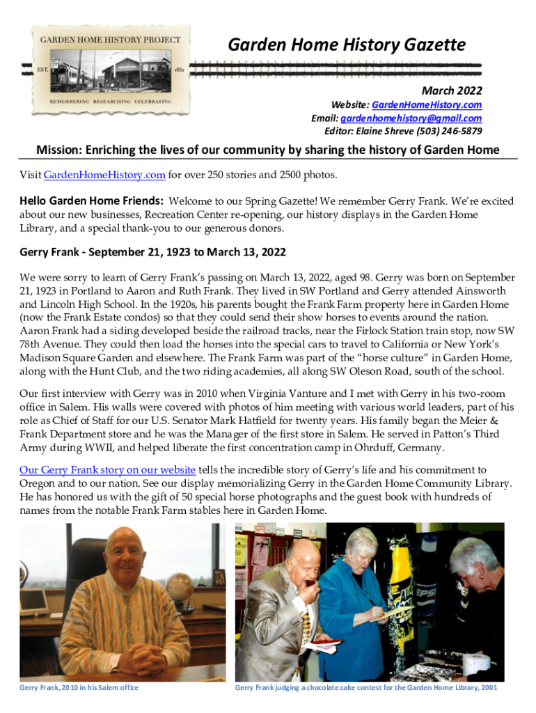 Garden Home History Gazette March 2022 Website: GardenHomeHistory.com Email: gardenhomehistory@gmail.com Editor: Elaine Shrive (503) 2465879Mission: Enriching the lives of our community by sharing