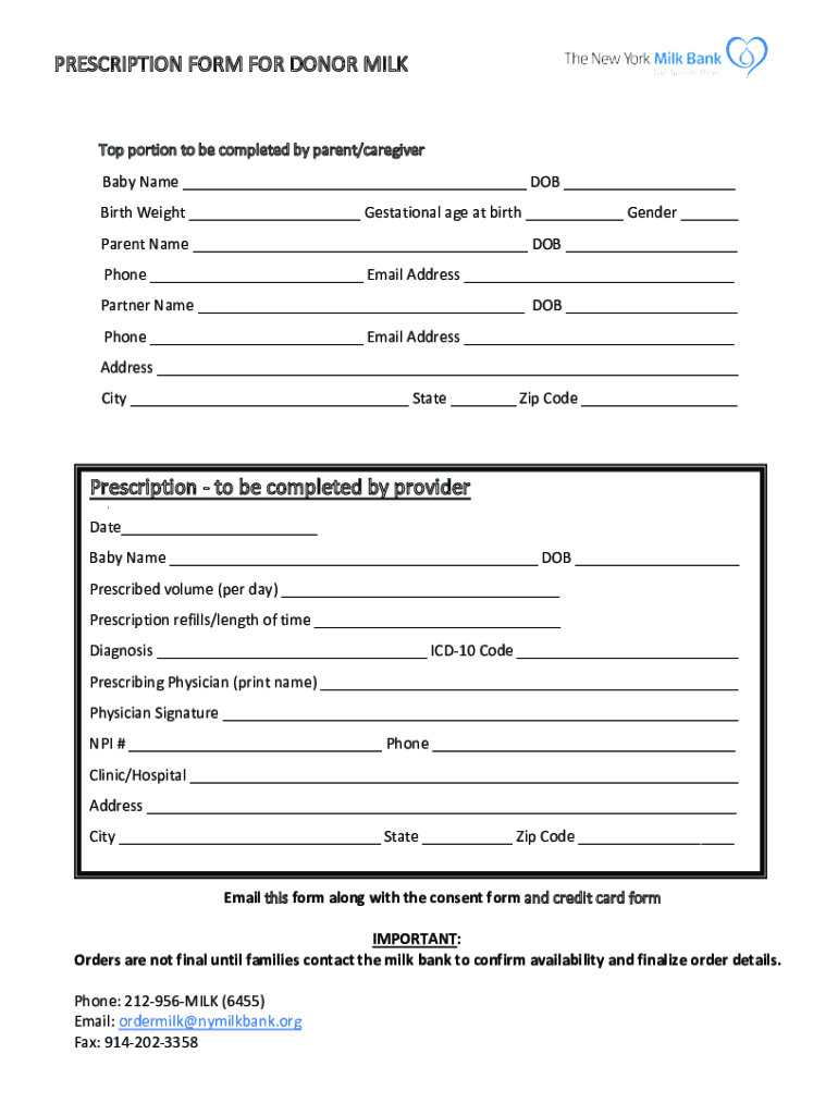 PRESCRIPTION FORM FOR DONOR Milksop portion to be completed by parent/caregiver Baby Name ___ DOB ___ Birth Weight ___ Gestational age at birth ___ Gender ___ Parent Name ___ DOB ___ Phone ___ Email