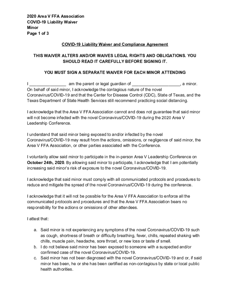 2020 Area V FFA Association COVID19 Liability Waiver Minor Page 1 of 3 COVID19 Liability Waiver and Compliance Agreement THIS WAIVER ALTERS AND/OR WAIVES LEGAL RIGHTS AND OBLIGATIONS. YOU SHOULD READ