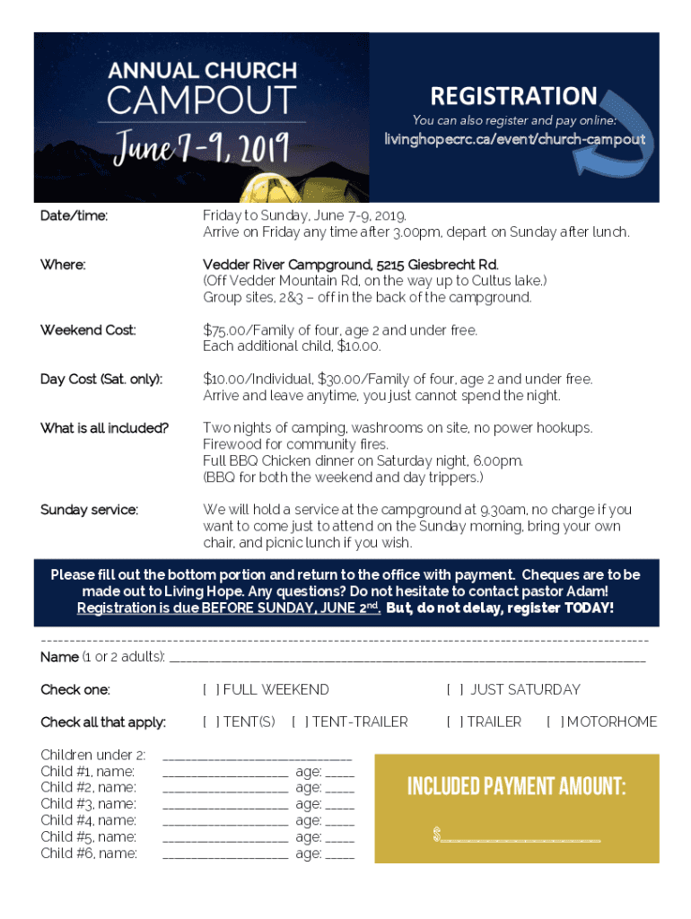 REGISTRATIONYou can also register and pay online:livinghopecrc.ca/event/churchcampoutDate/time:Friday to Sunday, June 79, 2019. Arrive on Friday any time after 3.00pm, depart on Sunday after lunch.Where:Vedder
