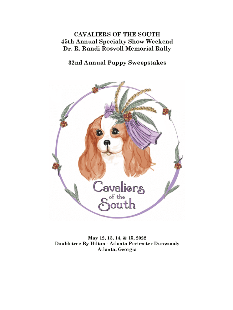 CAVALIERS OF THE SOUTH 45th Annual Specialty Show Weekend Dr. R. Randi Rosvoll Memorial Rally 32nd Annual Puppy SweepstakesMay 12, 13, 14, & 15, 2022 Doubletree By Hilton Atlanta Perimeter Dunwoody