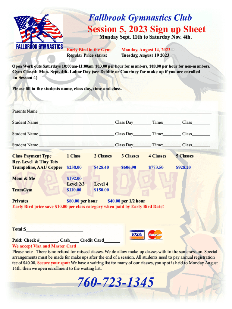 Fallbrook Gymnastics Club Session 5, 2023 Sign up Sheet Monday Sept. 11th to Saturday Nov. 4th.Early Bird in the GymRegular Price starts:Monday, August 14, 2023Tuesday, August 19 2023Open Work outs