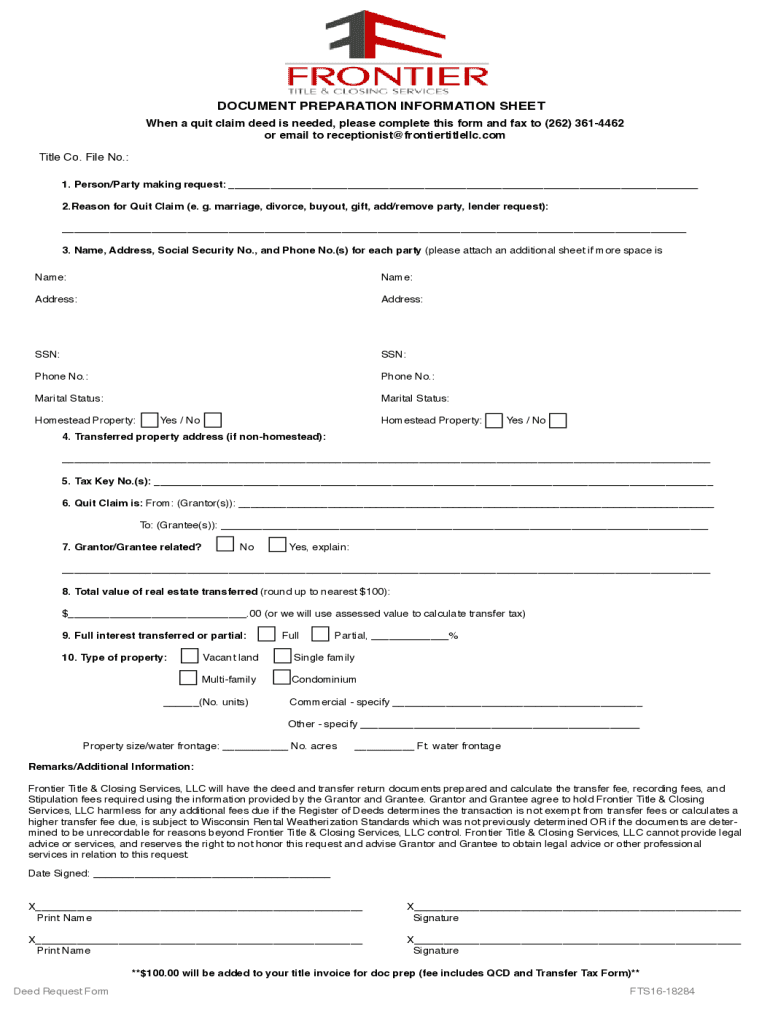 DOCUMENT PREPARATION INFORMATION Heathen a quit claim deed is needed, please complete this form and fax to (262) 3614462 or email to receptionist@frontiertitlellc.com Title Co. File No.: 1. Person/Party