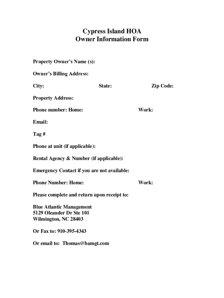 Cypress Island HOA Owner Information Form Property Owners Name (s): Owners Billing Address: City:State:Zip Code:Property Address: Phone number: Home:Work:Email: Tag # Phone at unit (if applicable):