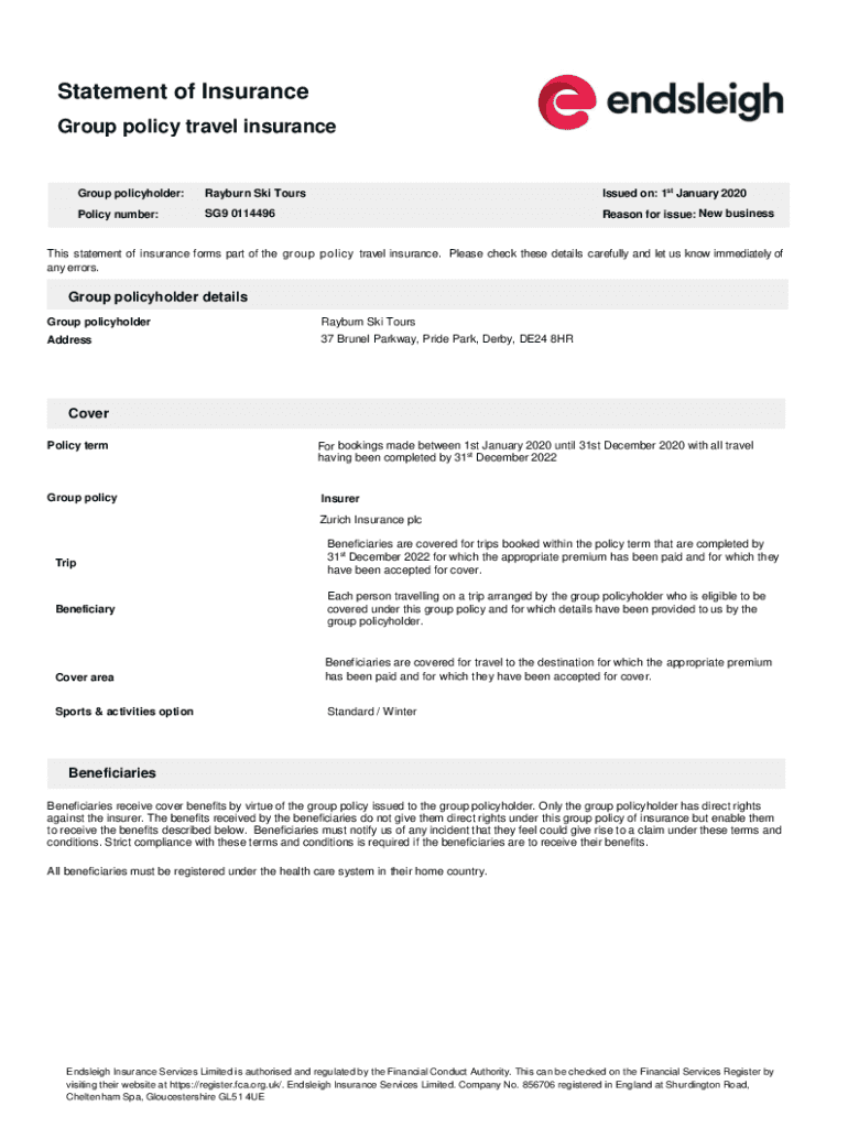 Group policy travel insuranceGroup policyholder:Rayburn Ski ToursIssued on: 1st January 2020Policy number:SG9 0114496Reason for issue: New businesses statement of insurance