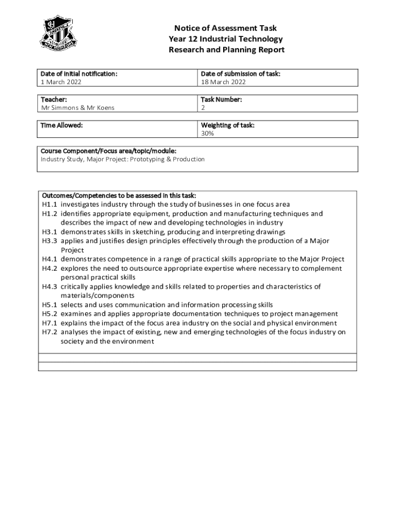 Notice of Assessment Task Year 12 Industrial Technology Research and Planning Report Date of initial notification: 1 March 2022Date of submission of task: 18 March 2022Teacher: Mr Simmons & Mr KoensTask