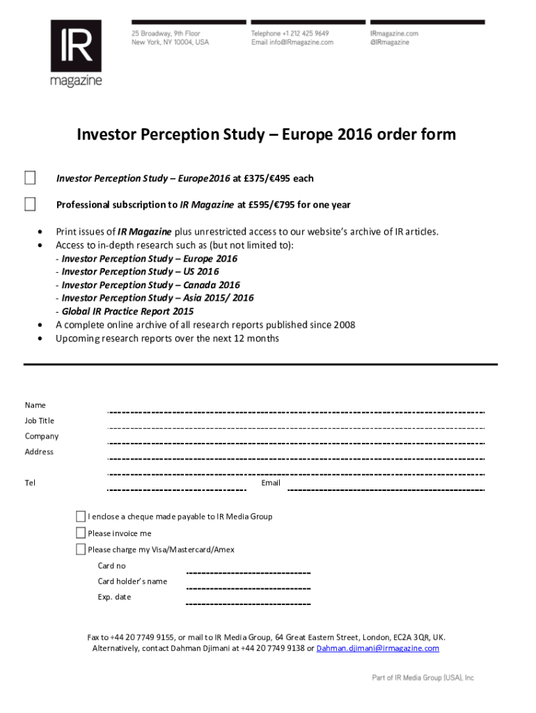 Investor Perception Study Europe 2016 order form Investor Perception Study Europe2016 at 375/495 each Professional subscription to IR Magazine at 595/795 for one year Print issues of IR Magazine plus