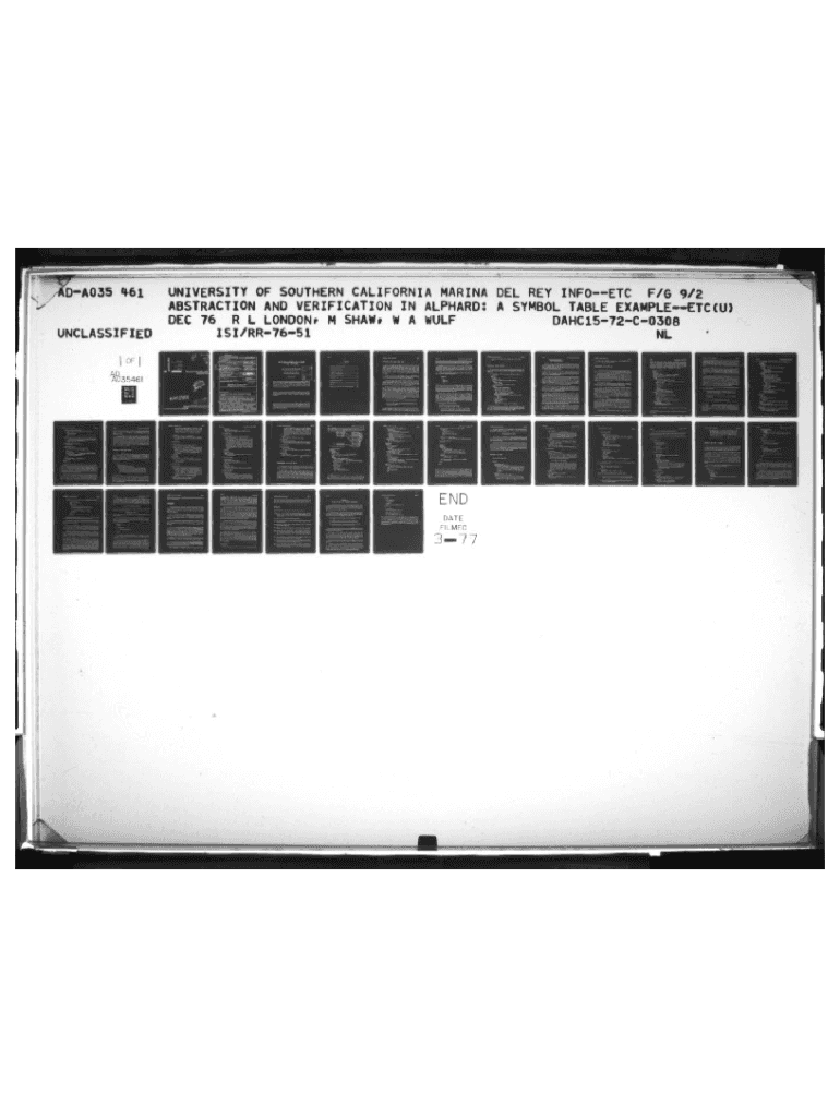 _ _ _ _ 2iAO35 Q61 UNCLASSIFIED_ _UNIVERSITY OF SOUTHERN CALIFORNIA MARINA DEL REY INFOETC FIG 9/2 ABSTRACTION AND VERIFICATION IN ALPHARD: A SYMBOL TABLE EXAMPLETC (U) DEC 76 R L LONDON. M 51MW,