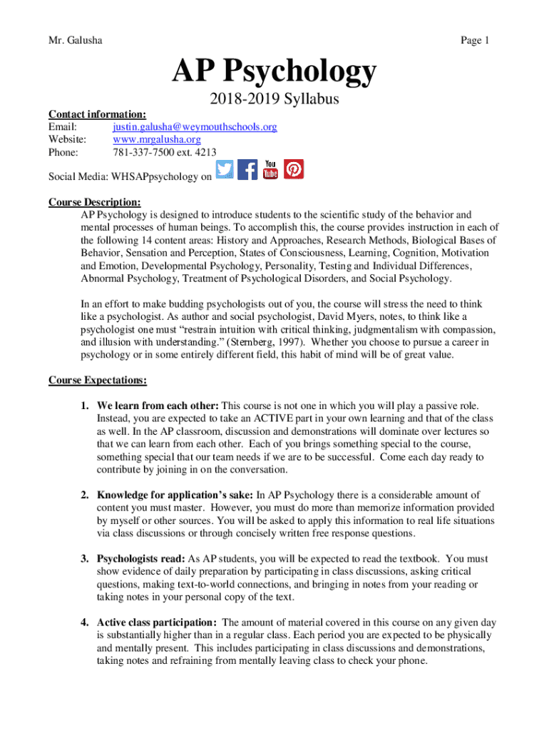 Mr. GalushaPage 1AP Psychology 20182019 Syllabus Contact information: Email: justin.galusha@weymouthschools.org Website: www.mrgalusha.org Phone: 7813377500 ext. 4213 Social Media: WHSAPpsychology