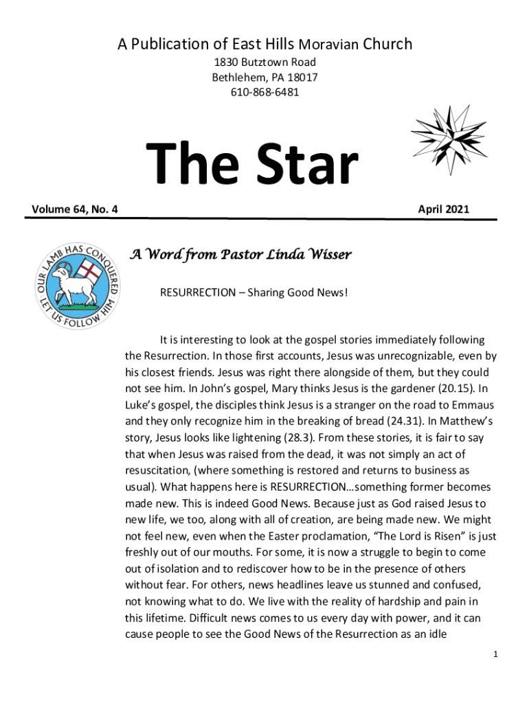 A Publication of East Hills Moravian Church 1830 Butztown Road Bethlehem, PA 18017 6108686481The Star Volume 64, No. 4April 2021 A Word from Pastor Linda WisserRESURRECTION Sharing Good News!It is