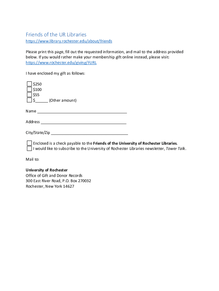 Friends of the UR Libraries https://www.library.rochester.edu/about/friends Please print this page, fill out the requested information, and mail to the address provided below. If you would rather