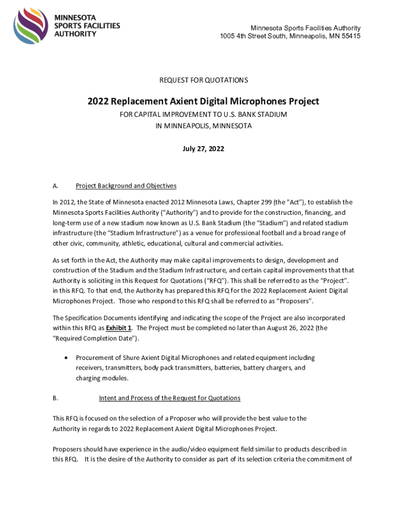 Minnesota Sports Facilities Authority 1005 4th Street South, Minneapolis, MN 55415REQUEST FOR QUOTATIONS2022 Replacement Adient Digital Microphones Project FOR CAPITAL IMPROVEMENT TO U.S. BANK STADIUM