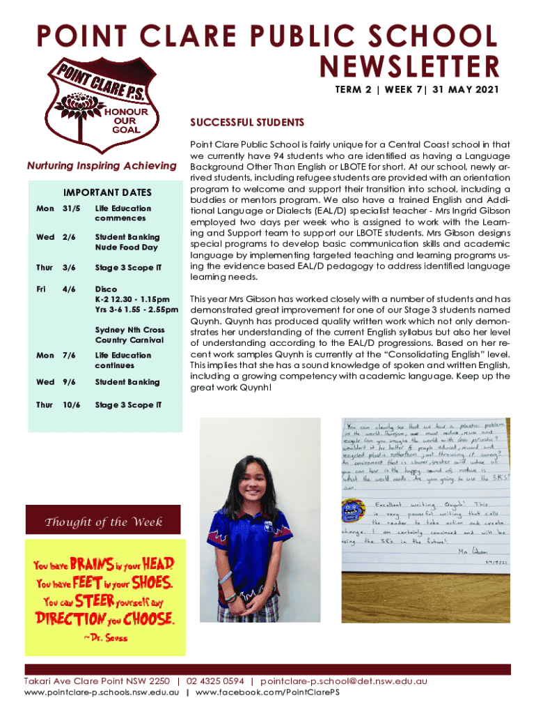 POINT CLARE PUBLIC SCHOOL NEWSLETTER TERM 2 | WEEK 7| 31 MAY 2021SUCCESSFUL STUDENTSNurturing Inspiring Achieving IMPORTANT DATES Mon31/5Life Education commencesWed2/6Student Banking Nude Food DayThur3/6Stage