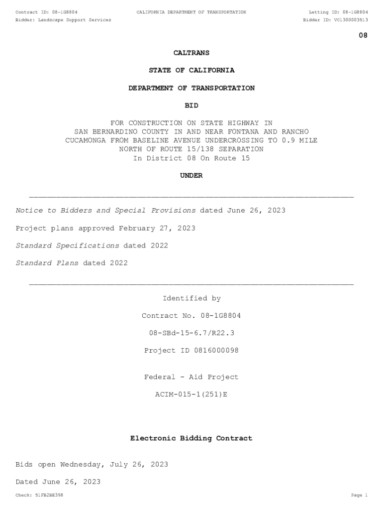 Contract ID: 081G8804CALIFORNIA DEPARTMENT OF TRANSPORTATIONBidder: Landscape Support ServicesLetting ID: 081G8804 Bidder ID: VC130000351308 CALTRANS STATE OF CALIFORNIA DEPARTMENT OF TRANSPORTATION