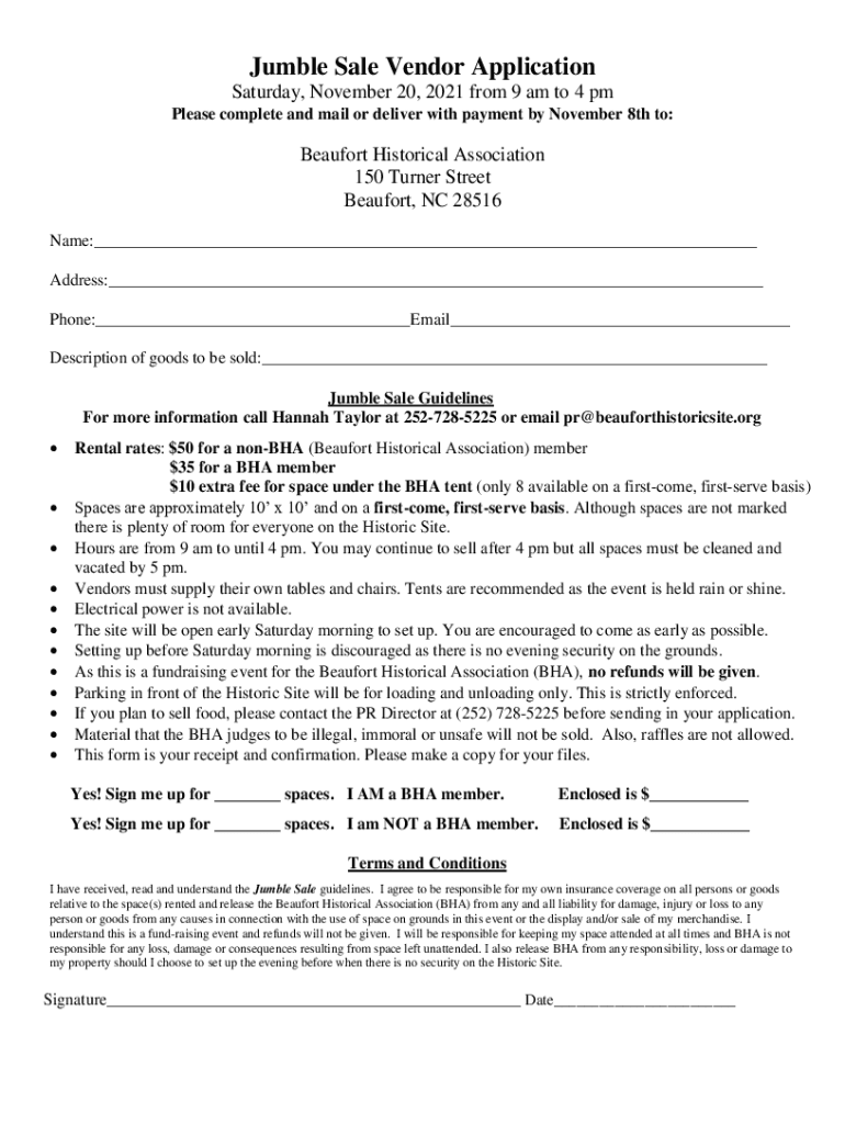 Jumble Sale Vendor Application Saturday, November 20, 2021 from 9 am to 4 pm Please complete and mail or deliver with payment by November 8th to:Beaufort Historical Association 150 Turner Street Beaufort,