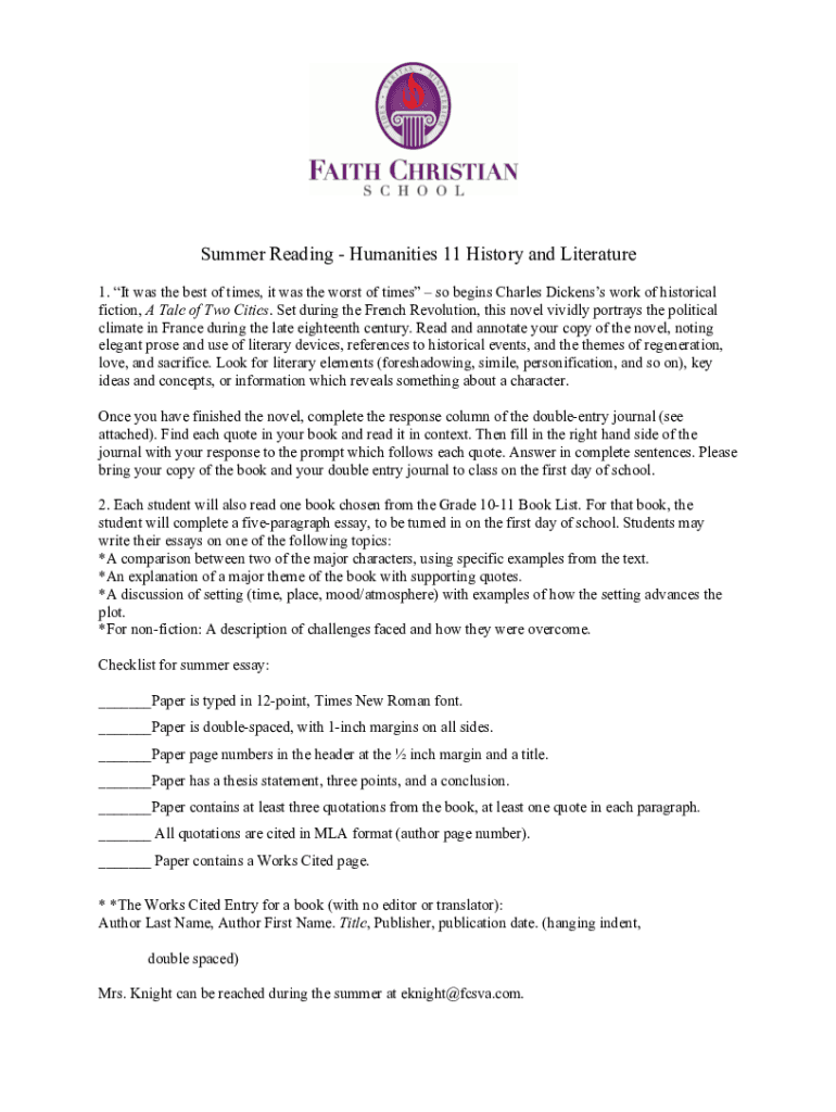 Summer Reading Humanities 11 History and Literature 1. It was the best of times, it was the worst of times so begins Charles Dickens's work of historical fiction, A Tale of Two Cities. Set during