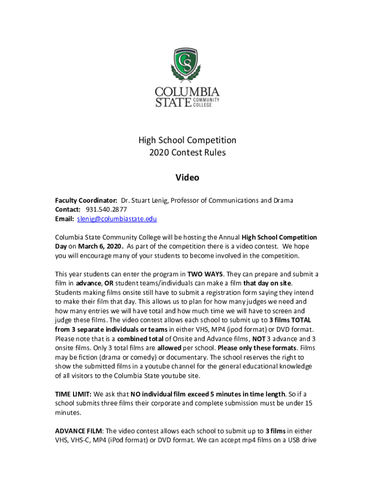 High School Competition 2020 Contest Rules Video Faculty Coordinator: Dr. Stuart Lenig, Professor of Communications and Drama Contact: 931.540.2877 Email: slenig@columbiastate.edu Columbia State Community