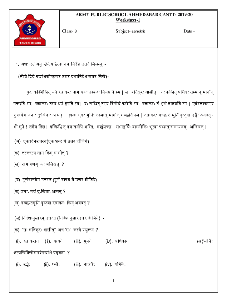 ARMY PUBLIC SCHOOL AHMEDABAD CANTT 201920 Worksheet1 Class 8Subject sanskritDate 1. ( )