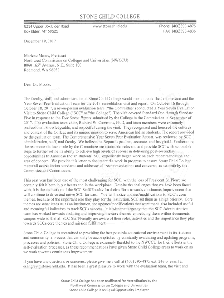 Stone Child CollegeWritten Response to Year Seven Pre-evaluation Report December 19, 2017Recommendation 1: The Committee recommends Stone Child College develop meaningful, assessable, and