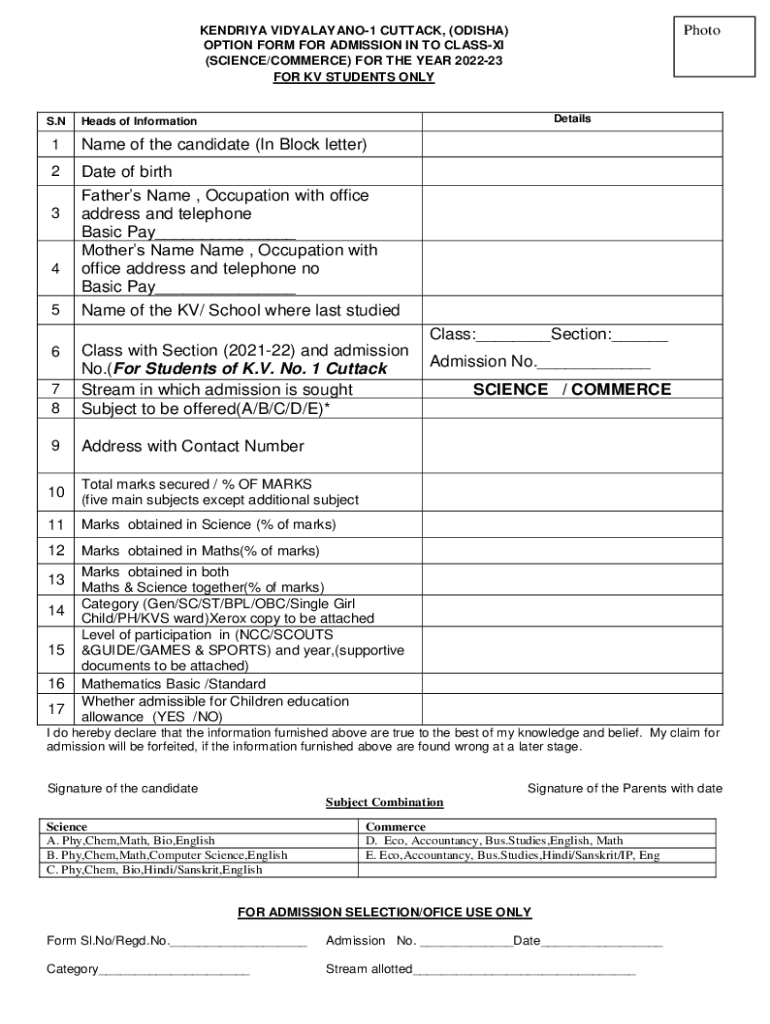 PhotoKENDRIYA VIDYALAYANO1 CUTTACK, (ODISHA) OPTION FORM FOR ADMISSION IN TO CLASS (SCIENCE/COMMERCE) FOR THE YEAR 202223 FOR KV STUDENTS ONLY.NDetailsHeads of Information1Name of the candidate (In